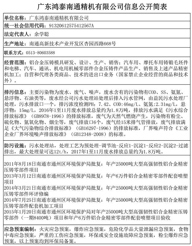 廣東鴻泰南通精機有限公司環(huán)保信息公開(kāi)簡(jiǎn)表